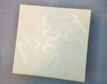Once the inks dry, apply a thick coat of white embossing paste through stencil 1 of the Vintage Tapestry Layering Stencil to the upper right and lower left-hand sides of the top of the box-one side must dry completely before applying the other. Then, on the back of the box, I applied the stencil 2 design from the Vintage Tapestry Layering Stencil.